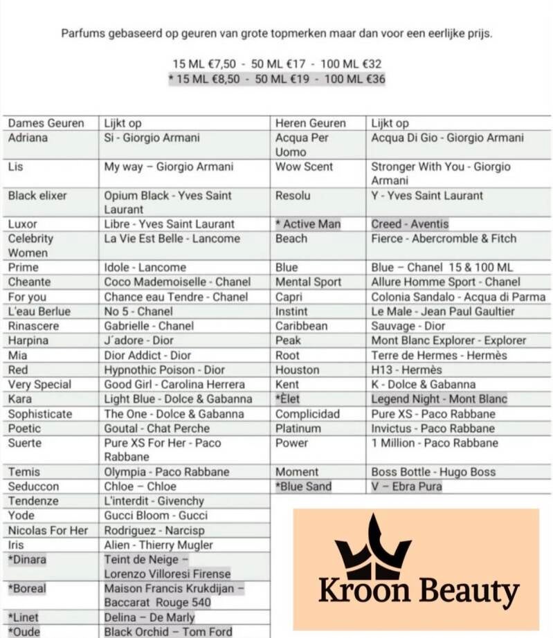 Ben jij al bekend met de geuren van Yodeyma? Dit zijn geuren gebaseerd op topmerken maar dan voor een eerlijke prijs! De geur is nagenoeg hetzelfde het zit alleen in een ander flesje! Hieronder vind je de lijst met de verschillende geuren en prijzen. Super leuk om cadeau te doen!